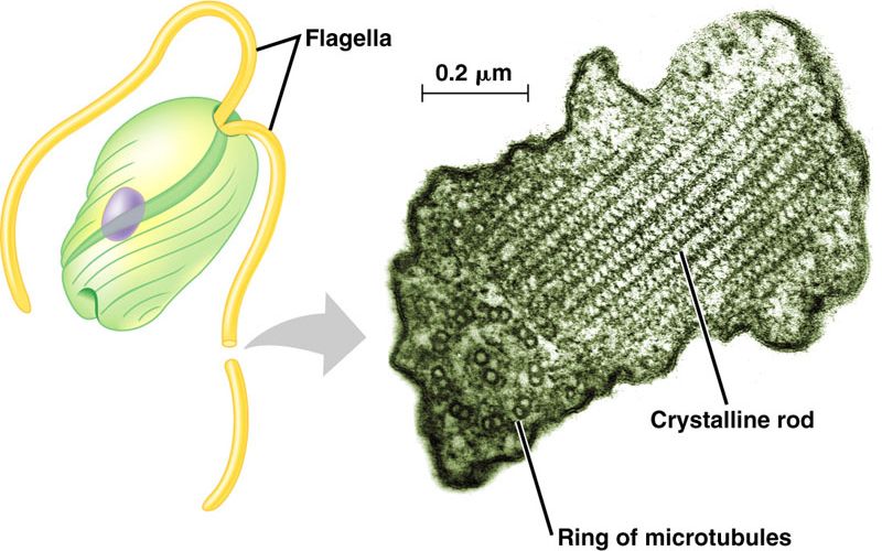 The rod lies alongside the 9 + 2 ring of microtubules found in all eukaryotic