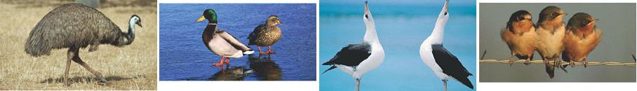 Emu. This Australian bird has no keel on its sternum and cannot fly. Mallards exhibit strong sexual dimorphism between the sexes. Many birds have specific courtship rituals. Laysan albatross: Barn swallows are perching birds; the toes can lock around a branch or wire.