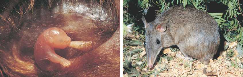 | The young of marsupials (such as this brushtail possum) are born early in their development. They finish their growth nursing from a nipple in their mother's pouch, or marsupium. | Bandicoots have rear-opening
