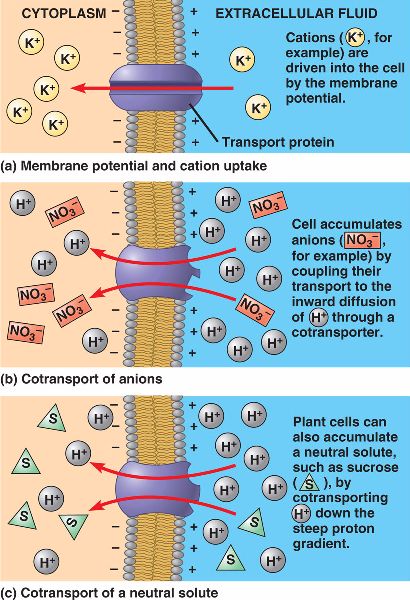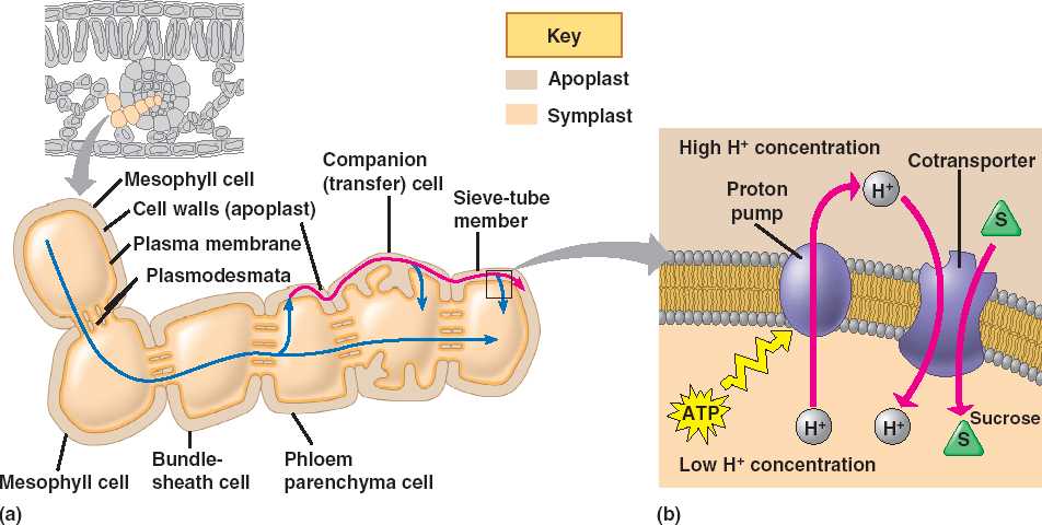 | Sucrose made in the mesophyll travel the symplast. Some sucrose exit the symplast and accumulate in sieve-tube members and companion cells via the apoplast. | Proton pumps generate an H+ gradient, driving sucrose accumulation in the cell by cotransport. | |