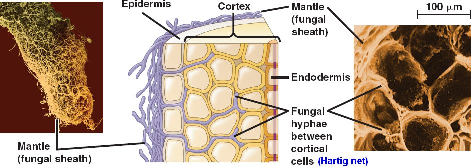 Hyphae also extend into the extracellular spaces of the root cortex, forming a "Hartig net",