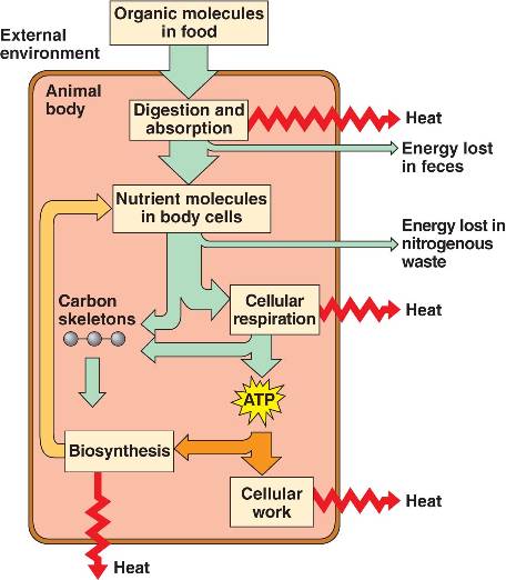 Energy from food is used to make ATP by cellular respiration, which powers cellular work.