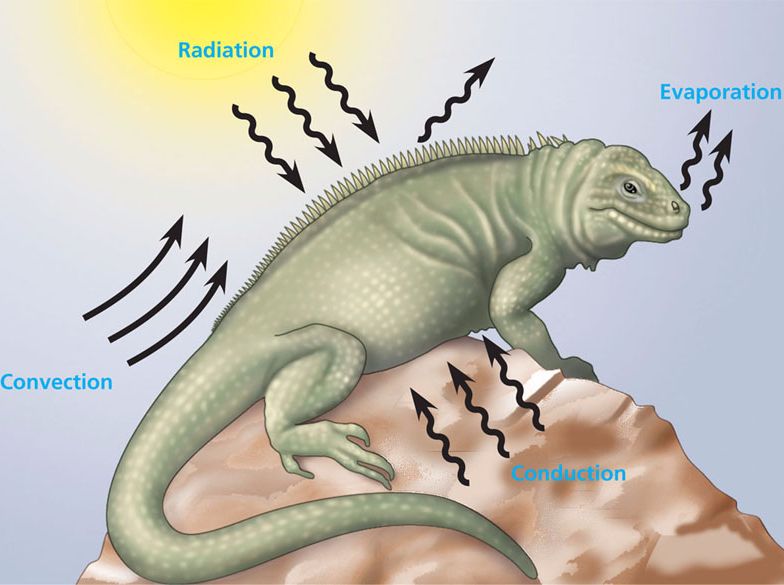 Conduction transfers heat by direct contact, as when a lizard sits on a hot rock.