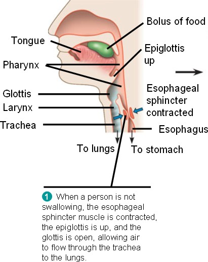 In the absence of food, the esophageal sphincter muscle is contracted and the epiglottis is up, allowing air to flow through the glottis and trachea to the lungs.