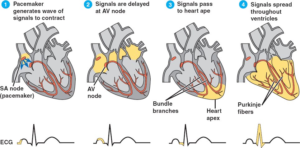 | The sinoatrial (SA) node (pacemaker) generates electrical impulses, which spread rapidly through intercalated disks between cells , causing both atria to contract in unison. | The impulses pass to the atrioventricular (AV) node, where they are delayed for 0.1 second to ensure that the atria empty completely during atrial systole. | Muscle fibers called bundle branches and Purkinje fibers conduct the signals to the apex. | Signals spread throughout the ventricles, which contract in ventricular systole. | |||