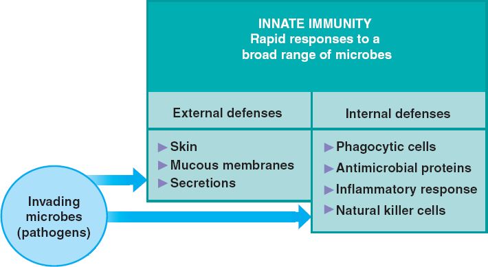 Innate defenses are those that are present at birth, and provide rapid protection against a broad range of invading pathogens.
