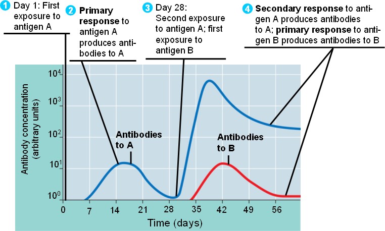 Memory cells generated in the primary response to antigen A give rise to a quick secondary response of antibodies to the same antigen.