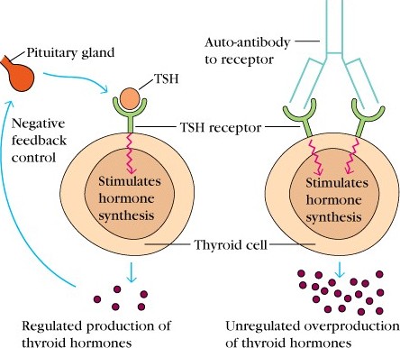 The body produces antibodies to the receptor for TSH, stimulating production of T3 and T4 and bypassing the TSH negative feedback loop.