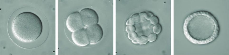 | Fertilized egg of an echinoderm surrounded by a fertilization envelope. | Four-cell stage after the second cleavage division. | Early blastula: individual cells of the multicellular ball are called blastomeres. | Later blastula: a single layer of cells surrounds a hollow blastocoel . | |||