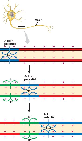 The depolarization-repolarization process is repeated as the action potential is propagated down the axon.