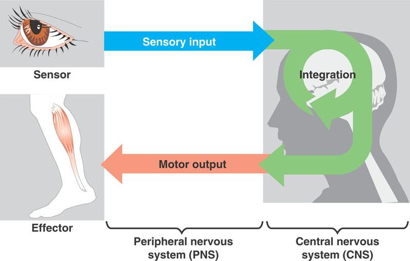 In the Peripheral nervous system (PNS), sensory neurons detect stimuli from ears and other sensors, and motor neurons carry out effector functions such as muscle contraction.