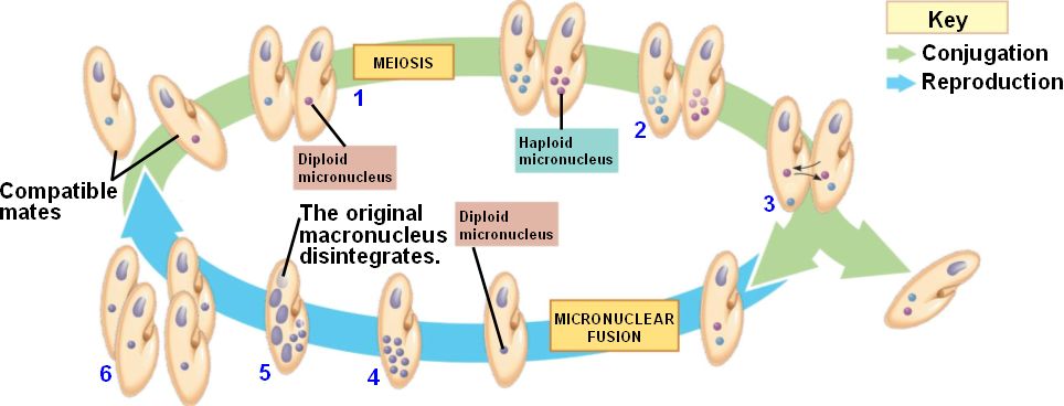 What are the functions of macronucleus and micronucleus? Macronuclei control normal functions; micronuclei exchanged in sexual conjugation.