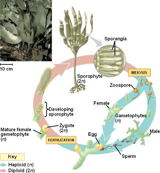 Illustrate alternation of generations as it occurs in green algae like Ulva.Show which stages are haploid and diploid, plus identify where meiosis occurs. Gametophyte is haploid,sporophyte is diploid,meiosis occurs in sporangia.